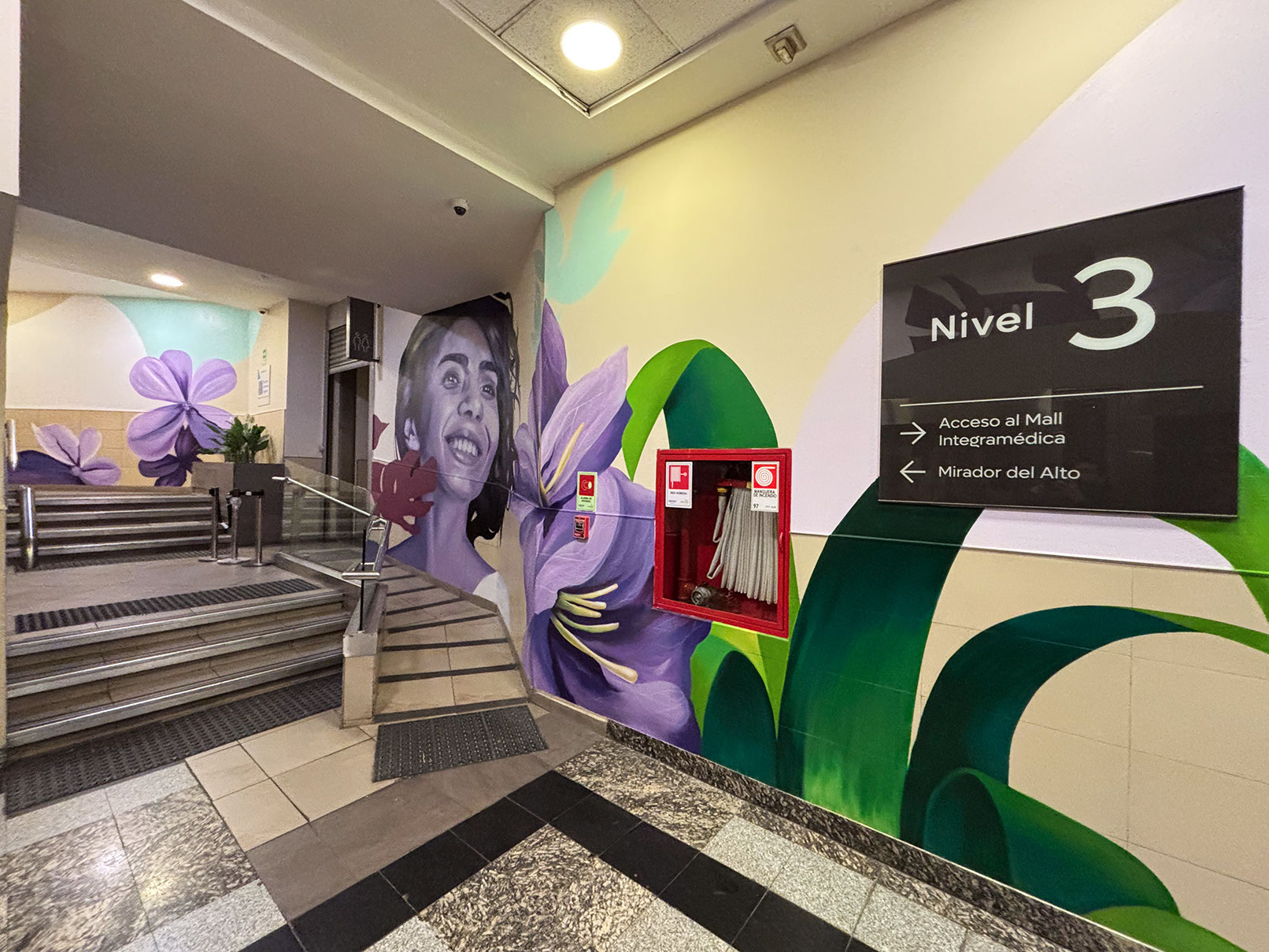 El mural Alto las Condes, fue concebido con una paleta de colores vibrantes pero no invasivos, pensados para integrarse armónicamente con la arquitectura sin restarle protagonismo. En la composición aparecen mujeres de distintas edades, elementos de la naturaleza, corazones y formas orgánicas, que juntos transmiten un mensaje de vitalidad, diversidad y afecto.